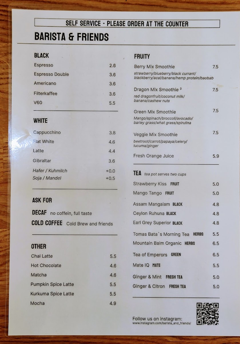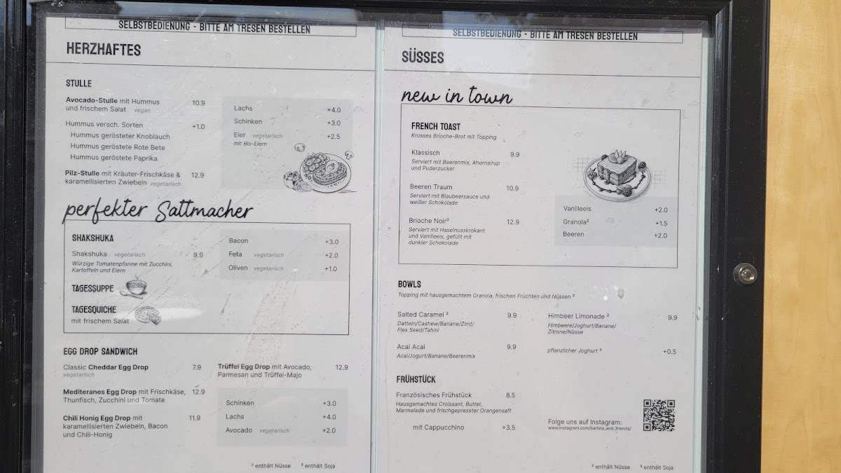 The menu at Café Barista & Friends in Potsdam offers a variety of options primarily focused on coffee and accompanying food items suitable for different times of the day, including breakfast and coffee breaks. Visitors can expect a selection of hot and cold coffee beverages, along with freshly prepared juices and a range of pastries and cakes.